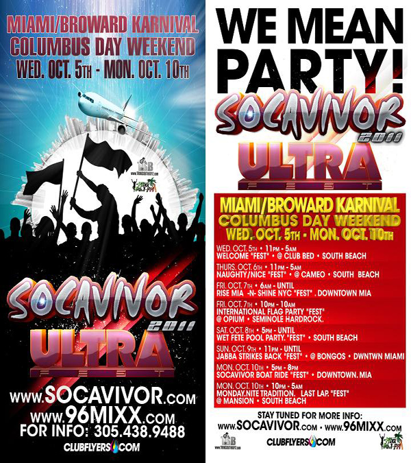 Monday October 10 TRADITIONAL LAST LAP MANSION 1235 Washlington Ave. Miami Beach . End the experience at the Ultra Last Lap Party the original Monday night tradition .Everyone in Black & Red .Hosted by Socavivor All Star Guests Imusic by GBM , Back 2 Basic ,D-Life , Massive B , Barry Hype ,Trixta, and Jester T.O. Reggae music by Young Chow , DJ Bulletproof , Bandon Lee & Disco , Cancer Hi-Power ,DJ Springer and Fergie. This is a night of pure vibes so All White is recommended.